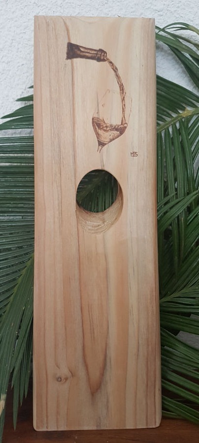 Pyrogravure d'un verre avec sa bouteille de vin.