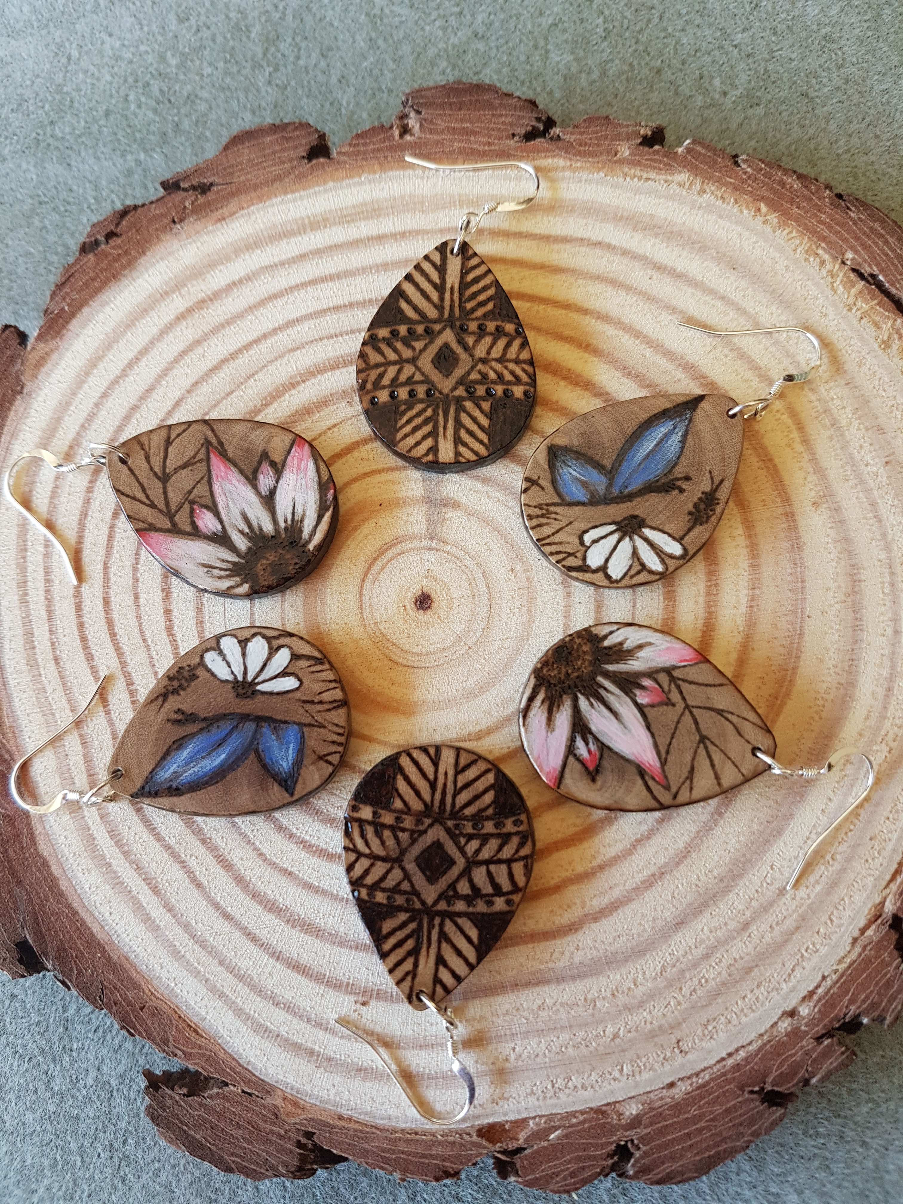 Pyrogravure fleur, peinture acrylique, protection vernis marin