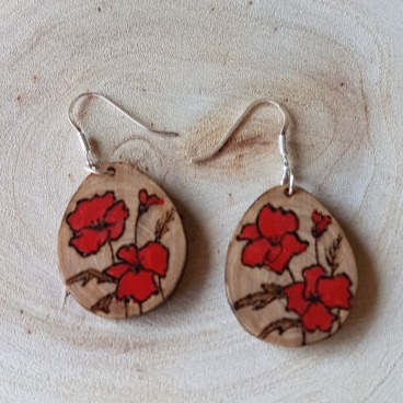 Pyrogravure Coquelicots, peinture acrylique, protection vernis marin