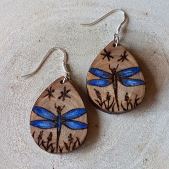 Pyrogravure Libellule bleue, peinture acrylique, protection vernis marin