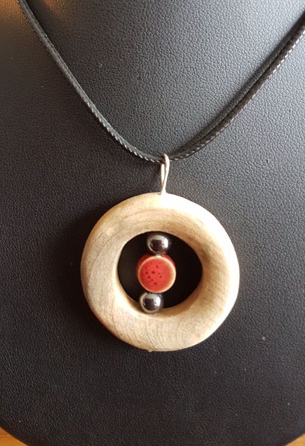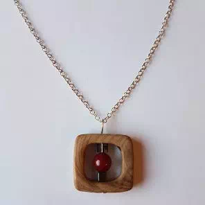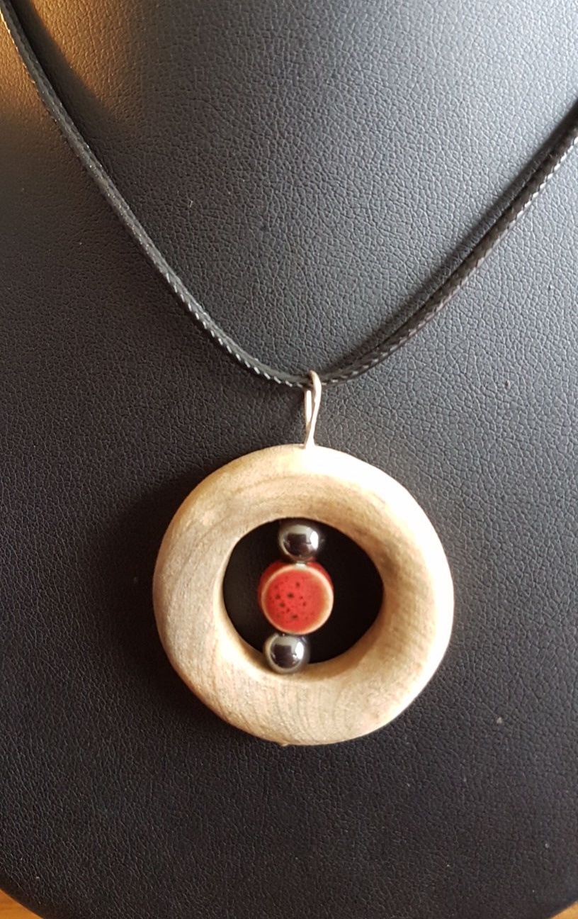 Pendentif en bois exotique de couleur rougeâtre naturelle.